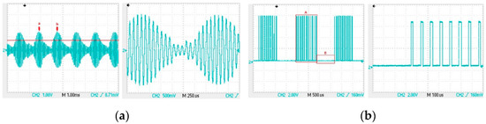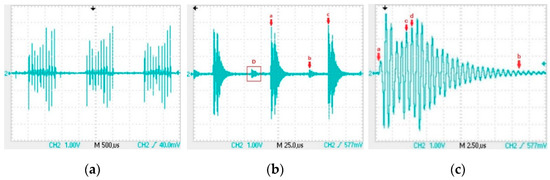 We load the “0” signal into the transmitting circuit and use a receiving coil to capture the signal. Analyze the signal waveform in the receiving coil to design a suitable signal amplification circuit. Figure 9 is the signal waveform received by the receiving coil, which is sequentially amplified as shown in the following three figures. In Figure 9b, the duration from point a to point c is 83 µs; the duration from point a to point b is 56 µs; and the duration from point b to point c is 27 µs. The duty cycle of the 12 kHz carrier loaded in the transmitting coil is 33%. It can be seen that the inductive signal in the receiving coil is mainly generated by the falling edge of the carrier wave in the transmitting coil, and the inductive signal caused by the rising edge is very small. The signal in the red D box in Figure 9b is caused by the rising edge. Enlarging a voltage fluctuation generated by a falling edge in Figure 9b to obtain Figure 9c, the total duration of the signal from point a to point b in Figure 9c is 20 µs, and the duration from point c to point d is 700 ns.