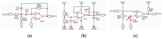 By observing the output OUT2 of the voltage comparator, we used a bandpass filter to remove the second part of noise. The filter circuit we designed, shown as Figure 12a, is a Chebyshev bandpass filter with a center frequency of 12 kHz and a bandwidth of 500 Hz. Figure 12b is a voltage follower that obtains half of the supply voltage through a resistor divider. This voltage is used as the analog power ground G. It is supplied to the filter and the voltage comparator in Figure 12c.