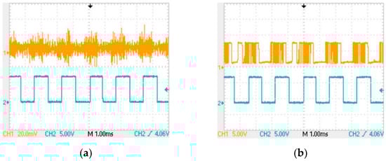 It can be noticed that the duration of the square wave of OUT4 in Figure 13b is 22 µs and 62 µs separately when it is in high and low voltage, and the duty cycle is about 26%. However, the duty cycle of the 12 kHz carrier initially loaded on the transmitting coil is 33%. The different duty cycle is because the signal in the receiving coil is only related to the level mutation of the signal in the transmitting coil but has nothing to do with its duty cycle. We adjusted the duty cycle of the carrier in the transmitting coil to 60%, and the duty cycle of the square wave in OUT4 is still about 26%. Fortunately, the square wave in the OUT4 will eventually be processed as a high-voltage signal, and the duty cycle did not affect this process. We used an integrating circuit shown in Figure 14a to remove the carrier wave. We connected the output OUT4 of the filter to this circuit. When there was a continuous square wave in OUT4 (box A in Figure 13b), OUT5 was high-voltage signal. When there was no continuous square wave in OUT4 (box B in Figure 13b), OUT5 was low. The waveform of the output OUT5 of the integrating circuit is shown in Figure 14b.