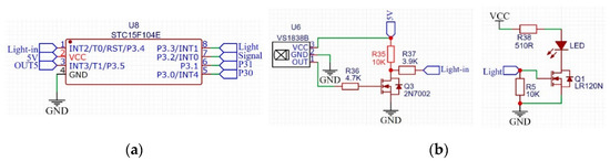 To eliminate accumulated errors, we ordered each repeater circuit re-modulated the information once. We connected the output OUT5 of the receiving circuit to a MCU, and the MCU would re-modulated the information after getting the information. Finally, the modulated information was loaded into the transmitting circuit to transmit it to the next relay circuit. In this way, the signal transmitted by each relay circuit was re-modulated by the MCU, by which the error could be eliminated. Each probe rod needs a relay circuit, which means a large amount of MCU is needed as well. Therefore, the cost of a single MCU should be reduced as much as possible to control the cost of the whole system. We chose STC15F104 produced by STC company [32], and its circuit is shown in Figure 16a. We connected the signal OUT5 output by the receiving circuit with the P3.5 pin of STC15F104 to receive the signal and connected the base of the transistor in the transmitting circuit in Figure 8 with the P3.2 pin of STC15F104 to send the modulated signal. Thus, we designed the relay circuit, and its signal processing flow is shown in Figure 17.