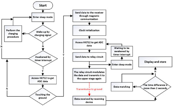The circuit board of pressure data acquisition in the CPT probe is required to realize the functions of collecting analog signals, modulating information, transmitting magnetic communication signals and recording system time. When the probe touches the ground, the acquisition circuit board in it will detect the pressure and send a start signal to the receiving device on the ground. At this time, the circuit board of pressure acquisition in the probe and the receiving device on the ground will start timing from 00:00:00 at the same time. Then, the pressure acquisition circuit collects a set of data per second as the hydraulic thrust device pushes the probe into the ground. When not working, the MCU will enter sleep mode to reduce power consumption [35]. After the sleep is over, the first step is for the MCU to access the two HX712 chips five times to obtain the values of the tip and sidewall bridges, respectively, and take the average of values collected in the last four times. After the access is over, HX712 will automatically stop supplying power to the sensor bridge, and HX712 itself will also go into sleep and wait for the next second MCU access to it. The second step is that the MCU modulates these two average values together with the current system time according to the method described in Section 4.1 and loads the modulated signal on the transmitting circuit to transmit these data. The third step is to back up the sent data to the SD card to ensure that in the extreme case of real-time communication interruption, the data can still be obtained from the SD card in the probe after the exploration is over. The fourth step is that the MCU enters the low power mode and waits for the end of the one second timer, and then performs the next work cycle.