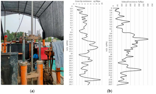 Cone penetration test (CPT) refers to a process that drives the probe with sensors into the soil through moderate and stable pressure at a constant speed as far as possible and measures the stress from the probe tip and the friction from the side wall in this process. After analyzing the stress from the probe at different depths by means of statistics, we can infer the properties of a soil layer [1,2,3]. CPT is characterized by a lower cost but higher reliability. It is widely used in geological exploration, building foundation monitoring, constructing offshore platform, evaluating soil condition, and so on [4,5,6,7,8].
