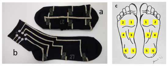 The smart textile sock pressure sensor system, used in the present research, consists of a pair of socks with 6 pressure sensors, knitted into the sole part of each sock: two on the heel, two under the arch, and two under the metatarsals, as seen in Figure 1a,b. The sensors are numbered according to Figure 1c: (1) front medial, (2) front lateral, (3) middle medial, (4) middle lateral, (5) heel medial, and (6) heel lateral.