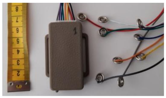 The data acquisition unit collects the measurement simultaneously from all 6 pressure sensors and transmits them via Bluetooth to a remote data processing device (smartphone), where the measurement is synchronized and saved to a file. The sampling frequency of data acquisition is up to 200 Hz per channel. The data acquisition unit communicates the current time in milliseconds, elapsed from the moment the device had been switched on, and readings of the six sensors’ resistance in kiloohms. The data acquisition unit is energized by a LiPo accumulator, that enables 8 h of continuous operation. A more comprehensive description of the system is presented in [,,].