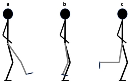 Participants were asked to perform the “single-leg squat” (SLS) and its variations seen in Figure 4: single-leg squat—front test; b—single-leg squat—middle test; c—single-leg squat—back test [].