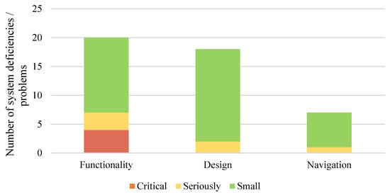The qualitative data analysis—a manual data transcript was made from the audio recordings. Inductive content analysis was performed. The researcher divided the identified usability problems into categories: design problems, functionality problems, and navigation problems. Positive comments were also included. The data are entered in a format that allows the researcher to identify key system weaknesses. System deficiencies/problems are categorized by severity: critical (user does not cope with the task); serious (dissatisfied user); small (user dislike but coping with the task at hand).