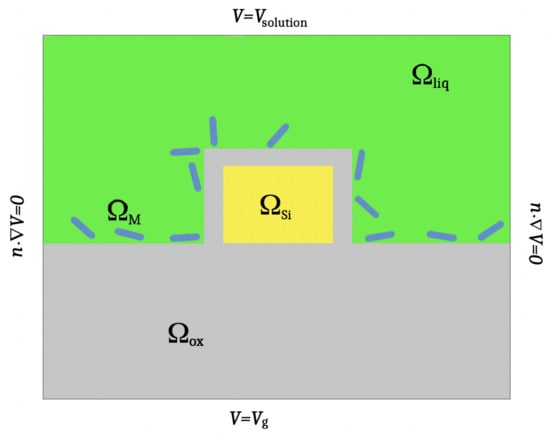 A schematic cross-section of a SiNW-FET depicting the subdomains, i.e., the transducer , SiO insulator (), the aqueous solution , the binding of the target molecules to the immobilized receptor molecules (), and the boundary conditions.