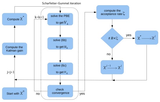 Here, indicates the covariance matrix between the identified unknowns and model response, points out the covariance matrix of the model response, and denotes the measurement noise covariance matrix []. In addition, is the residual of the proposed values concerning the model and relates to the density of measurement. A summary of the relative algorithm is given in Algorithm 2. Finally, Figure 2 shows the implementation of EnKF-MCMC and Schafetter–Gummel iteration for parameter estimation and solving the model equations.