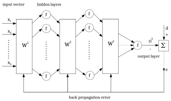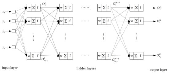 Typically, there are two common classes of neural networks, namely feed-forward neural networks (single or multilayers) and recurrent dynamics neural networks. Single-layer neural networks [] have less complexity; however, they are more suitable for linear problems. In multilayer feed-forward neural networks (MFNNs) [,], more than one layer of the artificial neurons will be used to enhance the capability to learn nonlinear patterns, which is more appropriate for BIO-FETs. In MFNNs, the neurons are organized in different non-recurrent layers, where in the first layer, we have the input vector (here are the parameters of the sensor), and the output is given to the first hidden layer. After the data processing, the data are transferred to the next layers using the weights; the procedure is followed until the latest MFNNs layer. These networks are also named multilayer perceptrons, and their structure is shown in Figure 3.