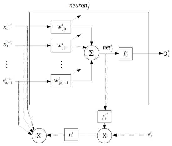 Figure 4 shows the jth neuron in the ith layer in the learning algorithm. In the recurrent process, in order to adjust the weights from the first layer, we follow as