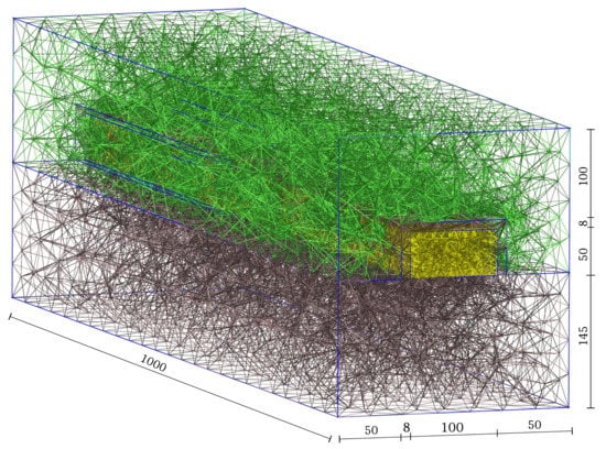 As we already mentioned, the DDP system is a roust and reliable system of equations to model the electrical behavior of the FET devices. We use a prostate-specific antigen (PSA) sensitive sensor which is used to diagnose prostate cancer. For the simulations, we use a sensor device with the nanowire length of 1000 nm, width of 100 nm and height of 50 nm, which is coated with SiO with 8 nm thickness. We use the finite element to solve the model problem, and tetrahedral meshes are employed to discretize the domain. A schematic of the bio-FET including dimensions using 6622 nodes and 45,735 tetrahedra is shown in Figure 5. The sensor is developed for the detection of 2ZCH (https://www.rcsb.org/structure/2ZCH). The PROPKA algorithm predicts the pK values of ionizable groups in proteins and protein–ligand complexes based on the 3D structure. The values are the basis for understanding the pH-dependent characteristics of proteins and catalytic mechanisms of many enzymes []. To compute the net charge, we performed a PROPKA algorithm [,,] to detect the net charge for different pH values. The simulations are completed using a pH value of 9, giving rise to the net charge of −15 q []. In field-effect sensors, surface reactions at the oxide surface depending on the pH value and the binding of charged target molecules result in changes in the charge concentration at and near the surface, and subsequently in changes in the electrostatic potential, which then modulates the current through the transducer. Since the molecules are negatively charged, the binding of the target molecules to the bio-receptors will enhance the charge conductance and increase the response of the sensor (i.e., the electrical current).