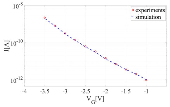 As the first step, we verify the model accuracy with the experiments. We compute the electrical current I with respect to different gate voltages where the source-to-drain voltage V, doping concentration cm, and the thermal voltage . The experimental data are taken form []. In order to solve the nonlinear coupled system of equations, a Scharfetter–Gummel-type iteration is used. Figure 6 shows the current as a function gate voltage varying between and for experimental and simulation values. These results indicate that the DDP system is reliable and will be used for the next simulations.