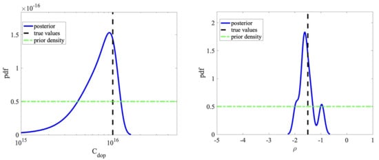 The molecules are negatively charged (here, −15 q is used); however, an accurate estimation of the molecule charge density will be necessary. In semiconductor devices, in order to enhance the conductivity, impurity atoms are added to the silicon lattice, namely the doping process. Higher doping concentration will improve the transistor conductivity; however, the device will be less sensitive to the charged molecules. Physically, doping concentration (as a macroscopic quantity) denotes the average amount of the dopants. We implemented a delayed rejection adaptive Metropolis (DRAM) [] and the Metropolis–Hastings algorithm [] to infer doping concentration, molecule charge density, and probe–target density. The efficiency of the EnKF-MCMC compared to these algorithms is studied in []. Therefore, we employ the Kalman filter for the proposal adaptation. We performed the MCMC algorithm with N = 10,000 iterations, and a uniform prior density is used. The computational aspects are summarized in Table 1.