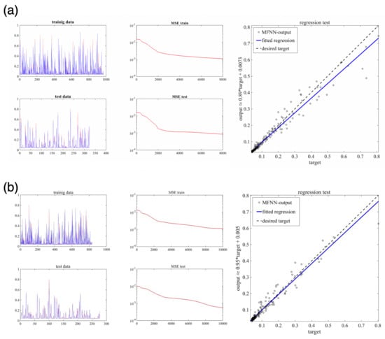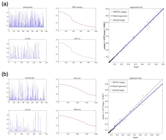 The performance of the MFNNs algorithm for Case 4 (a) and Case 5 (b). In the first column, the desired trajectories (shown in blue) are compared with the MFNN output (shown in red). In the second column, we have the relative MSE, and the regression test is given in the third column.