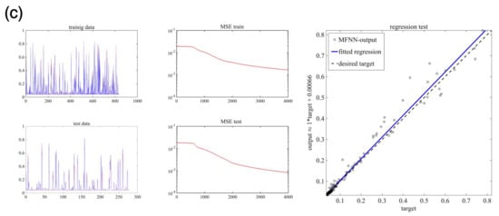 The performance of MFNNs algorithm for Case 1 (a), Case 2 (b), and Case 3 (c). In the first column, the desired trajectories (shown in blue) are compared with the MFNN output (shown in red). In the second column, we have the relative MSE, and the regression test is given in the third column.