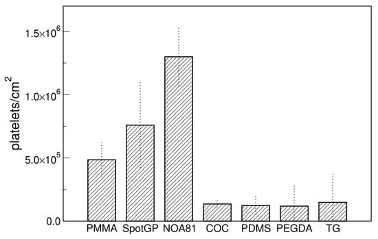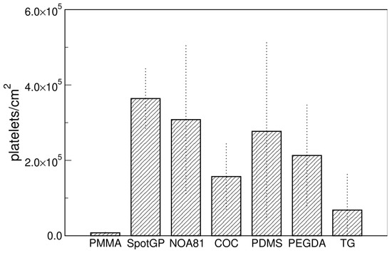 The adhesion of platelets on the seven polymeric materials analyzed in this study was firstly evaluated as density of platelets, calculated as absolute number per unit area. Comparing the different materials (Figure 1), the presence of two main groups is evident: a first group includes PMMA, SpotGP and NOA81, while the second group comprises all the four remaining materials, i.e., COC, PDMS, PEGDA and TG. The first group is characterized by a quite high platelets adhesion, which reaches (1.2 ± 0.2) × 106 platelets/cm2 for NOA81, whereas the second group shows an average adhesion nearly 10 times lower. Polymers belonging to the two groups do not share apparently similar features, since they are prepared with different methods (PMMA by milling from sheets, SpotGP by 3D printing, NOA81 by replica molding) and are different for physical properties like stiffness, roughness as well as chemical properties, as described in the previous paragraph. PMMA is indeed a transparent thermoplastic polymer belonging to engineering plastics, while SpotGP is an acrylate-based photoactive resin, and NOA81 is a mercapto-ester resin (see Table 1).