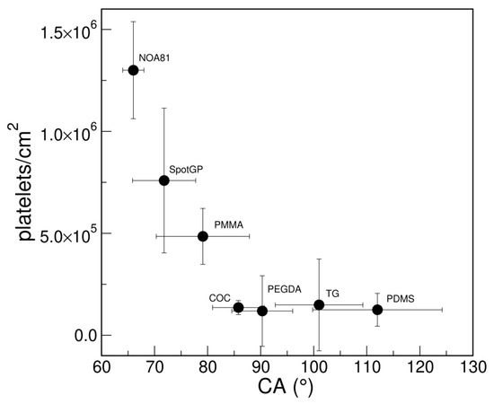 Looking at the wettability of the studied polymers, a good correlation is observed between platelet density and CA results (Figure 3). Hydrophobic surfaces, such as PDMS and TG, as well as the slightly hydrophobic polymers COC and PEGDA, show a low platelet density measured by SEM, while less hydrophobic (i.e., PMMA and SpotGP) and more hydrophilic (NOA81) polymers can capture a higher number of platelets per unit area. Therefore, the wettability of the polymeric materials resulted in being crucial both in reducing or promoting platelet adhesion.