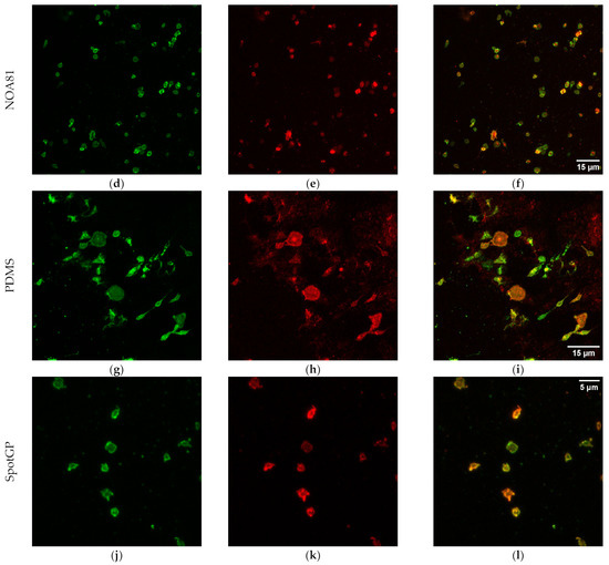 Besides number of platelets per unit area, the presence of platelets markers was evaluated. The CD41 antigen was selected as a platelet marker, while CD62P was selected as a marker of activated platelets. CD41 is a transmembrane glycoprotein, alternatively named integrin αIIb, known as a marker of the megakaryocytic lineage [48,52]. CD62P, or P-selectin, is an established indicator of platelet activation that is usually stored in platelet α-granules, but upon appropriate activation is rapidly mobilized to the platelet membrane [50,51], where the expression of CD62P is dramatically increased. This increment is accompanied by a simultaneous increase in the expression level of plasma soluble CD62, which plays an important role in the initiation, formation, and expansion of thrombi. Beside platelet markers, membranes were also stained to demonstrate the possible presence of blood cells beyond platelets. Typical examples of platelets imaged on the different polymeric materials are shown in Figure 5, but all materials were imaged in the same conditions (see Figure S1 of the Supplementary Materials). In the first column of the figure the channel of CD41 is reported, in the second column, the channel of CD62P, while, in the third column the merge of the two channels is reported, to facilitate the marker co-localization. The CD41 antigen is homogeneously distributed on the membrane of platelets adherent on all four materials shown in the first column of Figure 5, as expected for a marker that identifies platelets. On the contrary, the distribution of CD62P varies on the different polymers (see the second column in Figure 5). Platelets adherent to COC present CD62P as granules inside the cell, not mobilized to the membrane, as visible from the co-localization image (third column in Figure 5). This material induces the adhesion of few platelets, as observed in absolute number per unit area both from SEM imaging (Figure 1) and from confocal microscopy (Figure 4). Moreover, the shape of the (few) platelets adherent to COC is round or discoid, typical of normal circulating platelets or to the first state in the adhesion to the surface [18,53]. On the contrary, PDMS and SpotGP show many activated platelets from dendritic and spread dendritic shape (Figure 5l) to fully spread (Figure 5i). On these materials, platelets mobilized the CD62P marker on their membranes, initiating the activation process, as attested by the co-localization of CD41 and CD62P visible in panels (i) and (l) of Figure 5. An intermediate behavior is instead observed for platelets adherent to NOA81, where round, dendritic and spread dendritic shaped platelets are visible. Analogously to shapes, CD62P distribution varies from inside the cell (localized into the granules) to the cell membrane (see panel (f) in Figure 5). Again, the studied polymeric materials are found to have different properties both in terms of platelet adhesion and activation, allowing for suggesting their use well-fitting different applications.