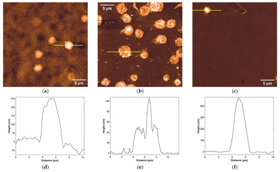 Representative AFM analysis of platelets adherent to: (a) PMMA (z false-color scale from −50 to 250 nm), (b) NOA81 (z false-color scale from −10 to 80 nm), and (c) COC (z false-color scale: −50 to 450 nm). The height profiles traced along the yellow lines are shown respectively in (d–f).