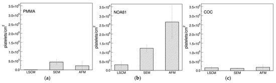 As shown in the previous paragraphs, different results were obtained by imaging the same samples with different techniques. The comparison of the adhesion extent using different analytical methods, indeed, highlights a quite large difference for some materials such as PMMA and, even more, NOA81 (Figure 7a,b), while others seem not very sensitive to the method of analysis (COC, Figure 7c). This behaviour may depend on the severity of the sample preparation that is needed for the different analytical techniques, the AFM being the mildest, and the LSCM requiring several incubation and washing steps for the fluorescent staining (see Section 2.5). This may indicate that the platelet adhesion on NOA81 is high, but not particularly strong, and that platelets can be then easily detached by fluxing aqueous buffers. This result could also indicate that the graph in Figure 4 and the images of Figure 5 actually refers to a platelet subpopulation that is composed by the platelets that are more strongly attached to the materials. Moreover, a similar behaviour could be found on materials which cannot be successfully examined with AFM (see Figure S3). SpotGP shows indeed the highest platelet density with a marked decrease when observed with LSCM. This phenomenon is not clearly visible for the other polymers shown in Figure S3.