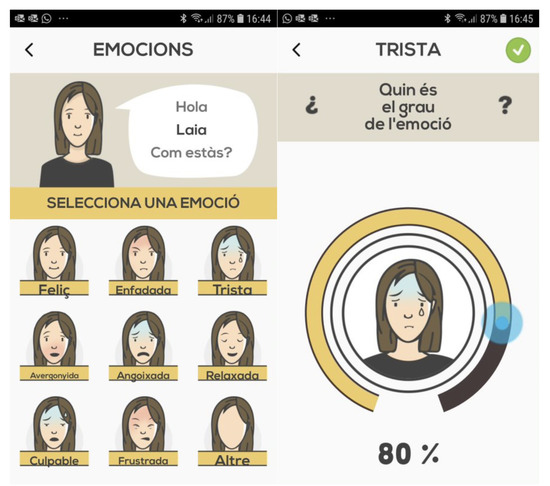 On the left, a screenshot with the list of emotions to report to the system. On the right, a detail on how to report the grade of the emotion by means of a sliding button (the text in the App is in Catalan. See the translated names of the emotions in Table 1).