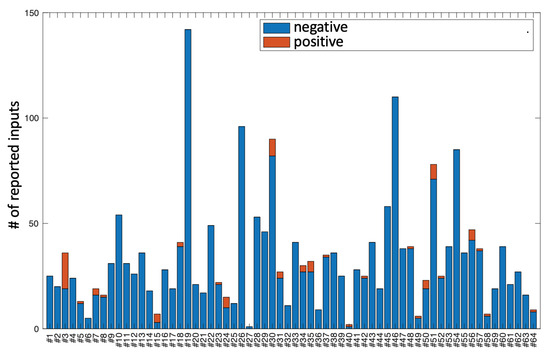 User interactions with the app were uneven. The number of interactions recorded with mobile devices varied considerably between users. This variability is represented graphically in Figure 2, where we can see, for example, that subject 19 interacted 142 times, but subject 27 only interacted once. It should be noted that, during the experiment, 24 users reported one or more self-injuries, which is slightly more than a third of the total. In the figure, the set of messages/interactions that the subject linked to a self-injury are shown in red, while the interactions that did not trigger self-injury (or were not reported) are shown in blue. A total of 2144 entries were recorded, 78 of which report self-injury while the remaining 2066 entries are not linked to self-injury. The subjects who reported self-injury can be identified in Figure 2 because in their corresponding bar, there is a portion of red colour. Note that subjects who self-injure usually do so more than once, so that almost all of them have more than one red entry.