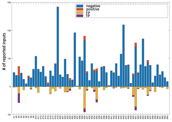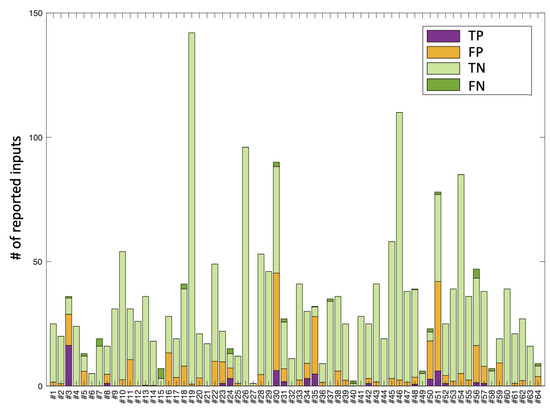Thus, Figure 4 shows the results of the test. First of all, note that the profile of the bars is the same as the one depicted in Figure 2 describing the content of the labelled database, as expected. In this figure, note that most of the TNs, which form the most frequent case, are correctly identified, hence the predominance of the light green colour. Note also that the TPs appear in dark violet and correspond to most of the positives marked in red in the figure. This is therefore a good behaviour of the classifiers because it means that a very high proportion of the frames labelled as positive are being detected as such. However, some of the records labelled as positive are not detected correctly, i.e., they are FNs, which correspond to the dark green section. In this sense, the most critical cases would be those of subjects 5, 7, 15, 40, 49 and 58, in which self-harm is not detected despite having been present. What these six subjects have in common is that they have made low use of the app. They are all in the low range in terms of the number of reported entries. Finally, false positives (FP) are the orange areas in Figure 4. In some cases, these entries warn of suspected self-harm from frames/entries that were labelled as such, but in subjects who end up presenting self-harm, as in the case of subject 18, for example. In general, it is of interest that the rate of FPs is as low as possible, so that the app can provide positive feedback to the user without being too intrusive and only when it is really useful, not indiscriminately.