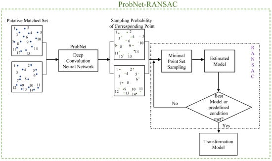 After processing of the feature extraction and feature description, each feature point had its own feature descriptor. In general, the feature descriptor’s Euclidean distance was adopted as a measurement, and the popular strategy of nearest neighbor distance ratio (NNDR) [13] was applied to acquire the putative matched point set. Therefore, the acquired putative matched point set was taken as the input for the geometric transformation model estimation. The schema of geometric transformation model estimation based on ProbNet-RANSAC is shown in Figure 2.