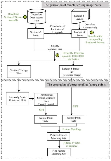 At the time of our study, there were no publicly available large remote sensing image registration data sets. However, the preparation of the training data was a very time-consuming and tedious work. In this study, we proposed a semi-automated method to generate training data, which reduced the workload greatly. The processing flow chart is shown in Figure 4.