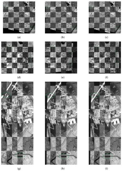 Checkerboard visualization for the qualitative experiments. The first column of images (a,d,g), the second column of images (b,e,h) and the third column of images (c,f,i) are the checkerboard visualizations of the original unregistered images, images registered by vanilla RANSAC, and images registered by ProbNet-RANSAC, respectively. Some areas circled by green ellipses contain distinctive ground features, from which it was easy to determine the result of image registration. Take each row of images as a unit, each circled area of one image has one corresponding circled area in the other two images; they almost cover the same content. For the circled areas in the unregistered images, their ground features were faulted, and it was hard to recognize them as a whole, which showed the geometric deformations between images. For the circled areas in the images registered by the method of vanilla RANSAC, their ground features were not strictly aligned, while for the circled areas in the images registered by the method of ProbNet-RANSAC, their ground features were aligned.