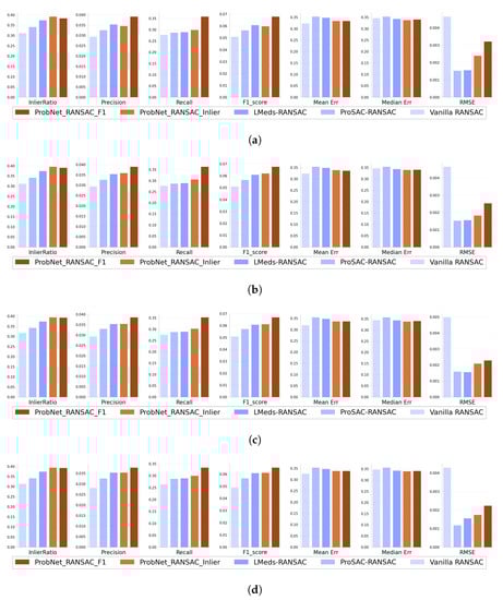 In terms of measures in the first group, namely InlierRatio, Precision, Recall and F1_score, both ProbNet-RANSAC_Inlier and ProbNet-RANSAC_F1 had superior performance, or at least slightly superior performance, as compared to the other three methods. Specifically, as compared to vanilla RANSAC, the proposed method had superior performance by a large margin. Combining the only difference in sampling the minimum samples from putative corresponding feature sets, namely vanilla RANSAC sampled uniformly while ProbNet-RANSAC sampled by the probability distribution generated by ProbNet-RANSAC; therefore, we could conclude that the probability generated by ProbNet played a vital role and could effectively guide sampling to improve the performance of the image registration. As compared to the other two methods, ProSAC-RANSAC and LMeds-RANSAC, the proposed method also outperformed them. In terms of some measures in the second group, namely Mean Error and Median Error, the proposed methods had slightly lower or almost equal values, as compared to the other three methods, while for the measure of RMSE, the proposed method had a lower value than vanilla RANSAC, but had a higher value than the other two methods, ProSAC-RANSAC and LMeds-RANSAC. The reason for the performance advantage of the proposed methods was that these measures were only calculated for their respective inliers for each method. However, according to the measure of InlierRatio, the number of inliers for each method was different; the proposed methods had the largest number of inliers, and vanilla RANSAC had the least. The smaller number of inliers may have been biased towards the lower value of the Mean and Median Errors. This is further discussed in the effects of loss function of ProbNet.
