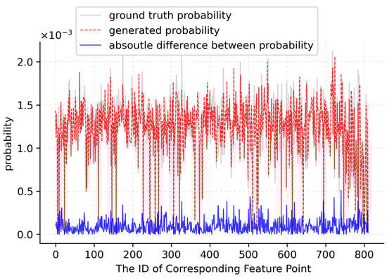 As shown in the figure, the probability distribution generated by ProbNet was very similar to the ground accuracy probability distribution, and the absolute probability difference of each corresponding feature point was also very small, much lower than the average probability of . The smaller the , the narrower the shape of the ground accuracy probability, which indicated that fewer corresponding feature points had large probabilities. To increase the generalization of ProbNet, the was set to a relatively large value of 1.2 in our experiment.