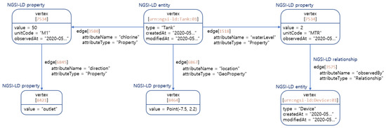 The application of the weighted RDF Graph approach to the water use case in Section 3.1 is depicted in Figure 7. Each NGSI-LD entity and property are mapped to a separate vertex. The key of the tank vertex is the id of NGSI-LD entity, and the tank vertex is characterized by the following attributes: type, createdAt, and modifiedAt. Every NGSI-LD property vertex is connected to the tank vertex via the edge. The property vertex models the NGSI-LD property “chlorine” and “waterLevel”, which are characterized by value, unitCode, and observedAt. The property vertex models the NGSI-LD geoproperty “location”, which is characterized by the point-type value. Its node is related to two other nodes which have the types property and relationship via the edge for “NGSI-LD Property” and “NGSI-LD Relationship” respectively. This property vertex presents the sub-property “direction”. The relationship edge is related to the property vertex waterLevel and to the device entity vertex.