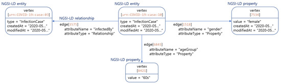 The application of the Graph DB approach to the water use case in Section 3.2 is depicted in Figure 8. Each NGSI-LD entity and property are mapped to a separate vertex. The key of the COVID-19 case vertex is the id of NGSI-LD entity, and the COVID-19 case vertex is characterized by the following attributes: type, createdAt, and modifiedAt. Every NGSI-LD property vertex is connected to the COVID-19 case vertex via the edge. The property vertex models the NGSI-LD property “gender” and “ageGroup”, which are characterized by value, createdAt, modifiedAt, and observedAt. Its node is related to two other nodes which have the types property and relationship via the edge for “NGSI-LD Property“ and “NGSI-LD Relationship”, respectively. The relationship edge is related to the entity vertex COVID-19 case to another COVID-19 case entity vertex.