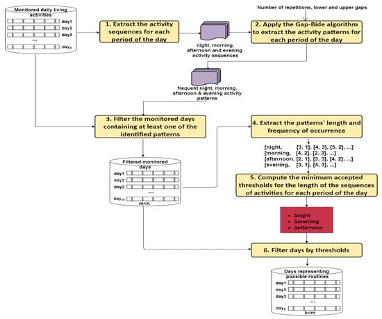 Frequent sequence identification using Gap-BIDE algorithm. Six steps are defined for extracting days that could represent routines or patterns.