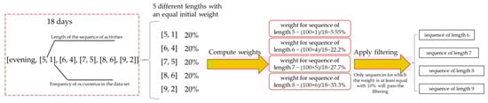 To illustrate this filtering process, we consider the example from Figure 3, where we have 5 different lengths for the evening sequences of activities: the sequence of length 5 appears once in the set of days, the sequence of length 6 appears four times in the set of days, etc. Initially, each sequence of activities corresponding to evening is assigned an equal weight of 20% of the total set. As certain sequences of marginal lengths (sequences of length 5 or length 9) are usually less common, it can be said that any sequence will pass the filter if the length of that sequence is met by at least 10% (half of what was initially allocated for each length) of cases. Consequently, in our case will pass the filtering, only the sequences of lengths 6,7, 8, and 9.