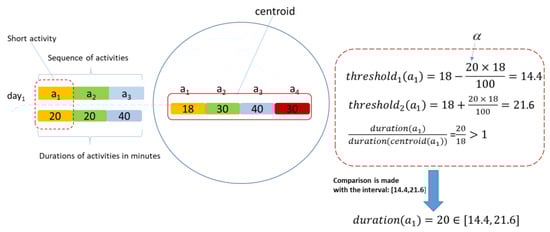 Figure 4 illustrates the steps followed to establish if the timespan of activity a1 is in the range computed based on the timespan of the same activity in the cluster centroid and depending on the type of activity.