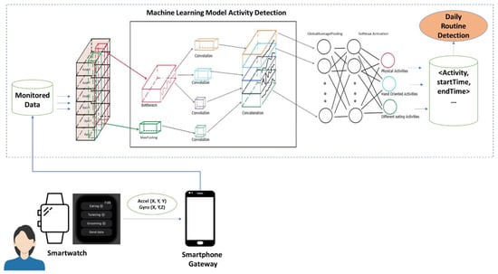 In general, smartwatches are successfully detecting sleeping and times outside of physical activities. So, for these times, we use the activity detection software available on the smartwatch. To determine other types of activities such as eating (e.g., Breakfast, Lunch, Dinner, Snack), toileting, personal hygiene, and spare time/TV a machine learning model was used. The smartphone is used as a gateway for collecting the data from the smartwatch sensors and forwarding it to the cloud. Each recorded data is composed of 6 values accelerometer (X, Y, Z) and gyroscope (X, Y, Z) the sampling rate being 100 Hz which provides the option of down sampling if needed.