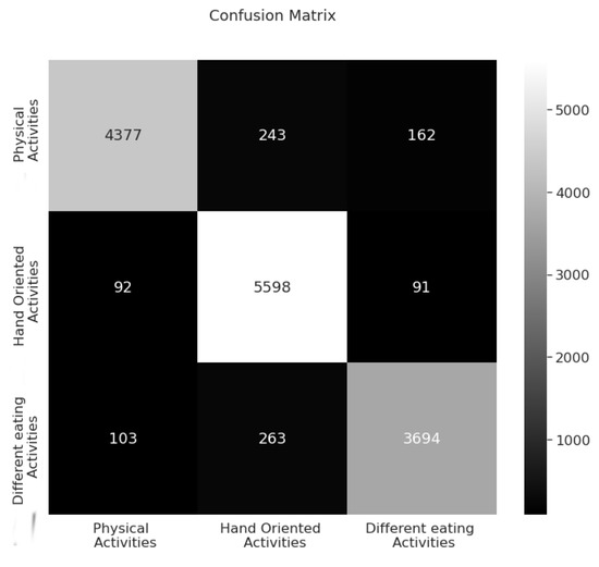The confusion matrix for activity detection. The better the model, the values outside the main diagonal are lower compared to the ones on the main diagonal.