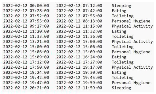Using the model presented above we can generate the Activity file which will be used as input for the person’s daily routine detection. It has the following structure on each line: startTime, finishTime, and activityType. Figure 7 provides a sample of the data set. The fragment contains information about the activities performed by a person in a day.