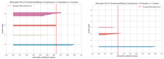 Silhouette analysis for K-Means clustering on time span vectors with k = 4 (left) and k = 7 (right). Cluster labels are colored differently. The average Silhouette score is shown with the dotted red line.