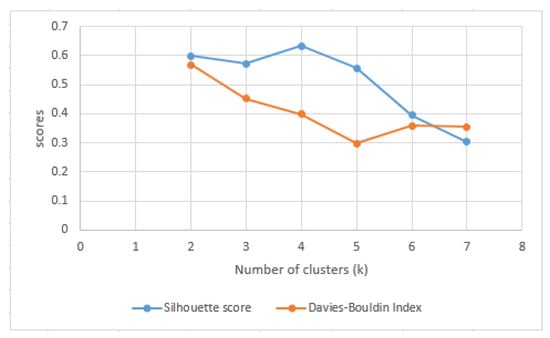 The value of 4 for the number of clusters is the optimal one, because even if we have clusters with the Silhouette score below the average, that average value is higher than for k = 2, 3, 5, 6, 7 and the Davies-Boulding index value is low (see Figure 10).