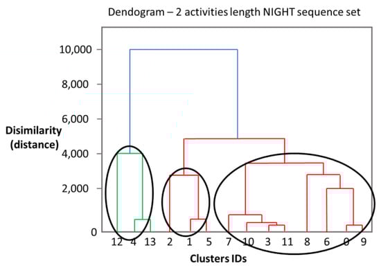 where is the inter-cluster distance (i.e., the distance between the cluster Xi and the cluster Xj), and is the intra-cluster distance of cluster (i.e., the distance within the cluster ). The optimum number of clusters is the number corresponding to maximized Dunn Index. Figure 11 shows the dendrogram resulting after running the Agglomerative Hierarchical Clustering algorithm on vectors of time span corresponding to the activity sequences that take place at Night (all activity sequences that take place at night are composed of two 2 activities).