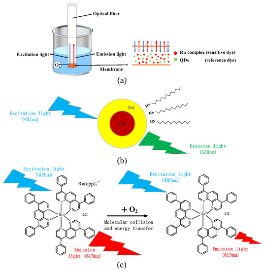 Oxygen has a quenching effect on fluorescence produced by some fluorescent substances, resulting in a decrease in fluorescence intensity and a reduction in fluorescence life. The purpose of an optical fiber DO sensor is to detect oxygen concentration by using a fluorescent substance as an indicator to generate fluorescence under light excitation of a specific wavelength, and oxygen has a quenching effect on fluorescence through the detection of the indicator’s degree of fluorescence. As presented in Figure 1a, we use ruthenium complex and QDs to coat the end of the optical fiber. When the excitation light enters the optical fiber, the fluorescent substance absorbs light of a specific wavelength. Its electrons gain energy, become excited, and release energy to return to the ground state by emitting fluorescence of a higher wavelength. The emission light is reflected out from the optical fiber. The fluorescence quenching reaction occurs at the interface of the membrane when the DO sensor is put into water and emitted by the light source.