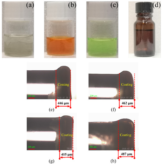 Chemical reagent and coating images of four optical fibers with different ruthenium concentrations (a) carrier matrix, (b) oxygen sensitive dye, (c) reference dye, (d) DO composite sensitive solution, (e) 0.1, (f) 0.2, (g) 0.3, and (h) 0.4 mg/mL.