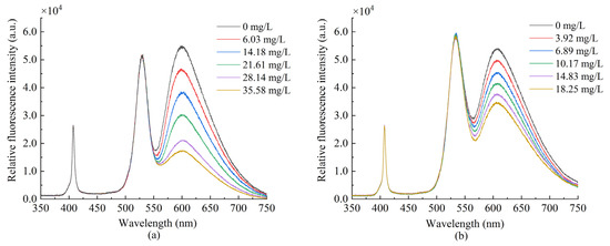 The oxygen-sensitive dye and the reference dye were coated, respectively, and the two sensing fibers were tested in gaseous oxygen to measure their fluorescence intensity. Figure 5 demonstrates that the fluorescence intensity of the ruthenium complex is the highest in the anoxic environment as the oxygen concentration increases, the fluorescence intensity gradually decreases, and the quenching effect becomes obvious. The QDs fluorescence intensity did not significantly change under different oxygen concentrations. It remained stable, indicating its suitability for use as a reference dye for ratiometric optical fiber oxygen sensor. Figure 6a presents the fluorescence response spectrum of the sensor made of composite sensitive materials in gaseous oxygen. QDs and ruthenium complexes at about 530 and 615 nm produce two emission peaks; as the oxygen concentration increases, fluorescence intensity gradually decreases due to the ruthenium complex fluorescence quenching, and the QDs fluorescence intensity is in numerical stability. Subsequently, we measured the fluorescence response spectra of the sensor in an aqueous solution, as presented in Figure 6b. As the oxygen concentration increases, the fluorescence intensity of the ruthenium complex gradually weakens, whereas the fluorescence intensity of QDs fluctuates within a certain range.