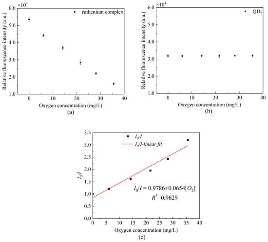 We measured the peak fluorescence intensity of QDs at 530 nm and the peak fluorescence intensity of ruthenium complex at 630 nm, respectively. In addition, we drew the Stern–Volmer equation curve using Equation (1). Figure 7 presents the changes in the peak value under the separate action of QDs and ruthenium complex. It can be seen that the ruthenium complex coating alone has a good correlation with the linearity up to 96.29%, and the sensitivity calculated reaches 0.0654/[O2] unit.