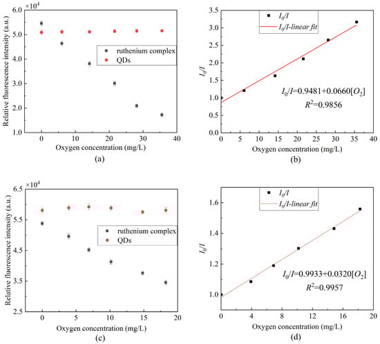 Fluorescence response at different oxygen concentrations (a) peak fluorescence intensity of ruthenium complex and QDs in gaseous oxygen, (b) Stern–Volmer equation curve of gaseous oxygen in the presence of mixed ruthenium complex and QDs, (c) peak fluorescence intensity of ruthenium complex and QDs in aqueous solution, (d) Stern–Volmer equation curve of aqueous solution in the presence of mixed ruthenium complex and QDs.