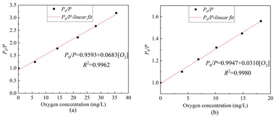The ratiometric Stern–Volmer equation curve of composite sensitive film under different oxygen concentrations (a) gaseous oxygen environment, (b) dissolved oxygen environment.