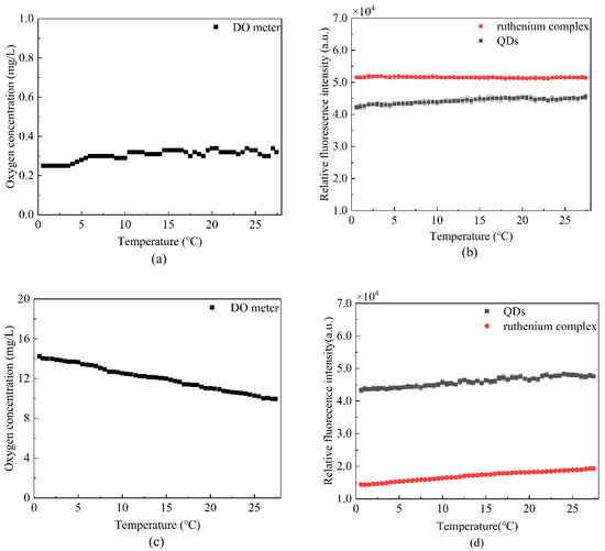 Temperature stability test (a) the oxygen concentration of saturated nitrogen solution measured by DO meter at different temperatures, (b) the fluorescence intensity fluctuations of ruthenium complex and QDs in saturated nitrogen solution at different temperatures, (c) the oxygen concentration of saturated oxygen solution measured by DO meter at different temperatures, and (d) the fluorescence intensity fluctuations of ruthenium complex and QDs in saturated oxygen solution at different temperatures.